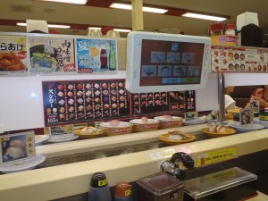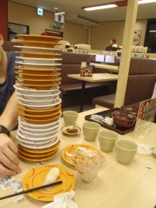 SushiRO is a restaurant in Japan where there are little conveyor belts everywhere carrying random pieces of sushi…that go around and around the tables and you just pick what you want as it trundles by. Not seeing what you want? there is a touch screen menu that you can flip through and order exactly what you want…a few minutes later…DING DING…order up…indicating that your order is about to roll on by! Coolest restaurant in existence….Did i mention that it is EXTRAORDINARILY cheap? Yes. I went to town on some sushi…had dessert. and only paid maybe 12 bucks. If you are a sushi person at all…you should realize that this is REALLY cheap….i ate probably 30 pieces of sushi. 105 yen a plate…and they just measure the height of your plates to see how much you owe.